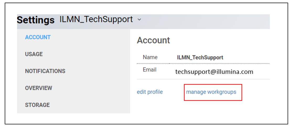Log into BaseSpace Sequence Hub. Switch to the workgroup by selecting the user name in the top right corner and select the workgroup. Select the user name again and select Settings. Then select manage workgroups.