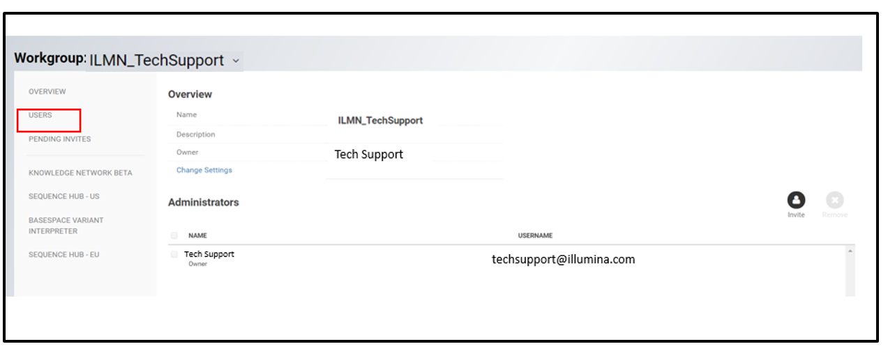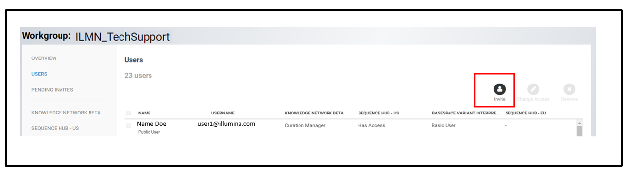BaseSpace Sequence Hub (BSSH) is the Illumina cloud-based platform for data management, storage, and analysis. There are three BaseSpace Sequence Hub subscription tiers – Basic, Professional, and Enterprise. The Workgroup feature for the Professional and Enterprise tiers gives BaseSpace Sequence Hub users access to pooled resources. A workgroup consists of users who share data, storage space, and other resources. Only the workgroup administrator (admin) can add users to a workgroup, as described in the steps below.