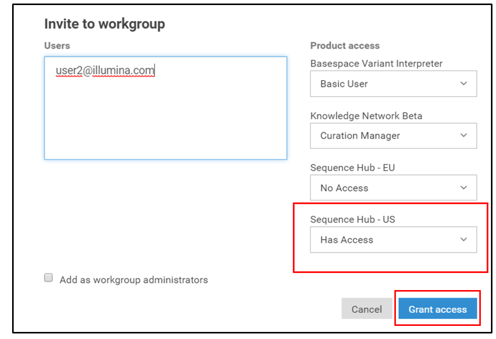 Add the BaseSpace Sequence Hub User IDs of your collaborators and make sure that Has Access to Sequence Hub - US (or EU, for the European Union instance) is selected. Then select Grant access