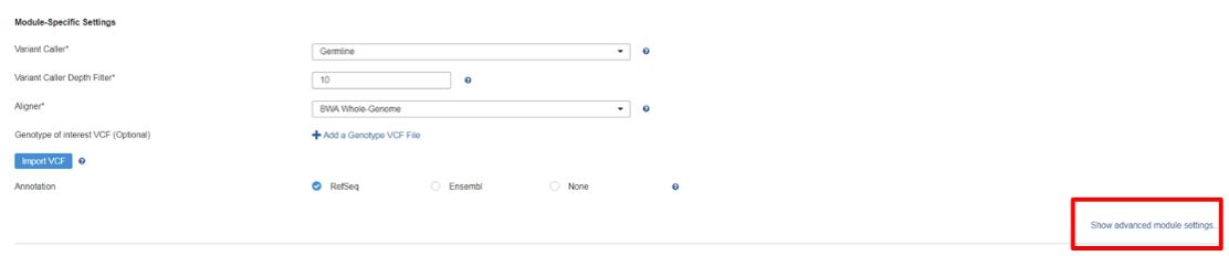 - Follow steps 3-5 of option 1 to choose module-specific settings, the manifest, and the reference genome.