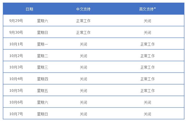 国庆假期期间,Illumina大中华区技术支持服务时间将按照下面表格进行安排,我们的反应时间也可能会有所延迟,请您谅解。我们将于2018年10月8日全面恢复正常工作。