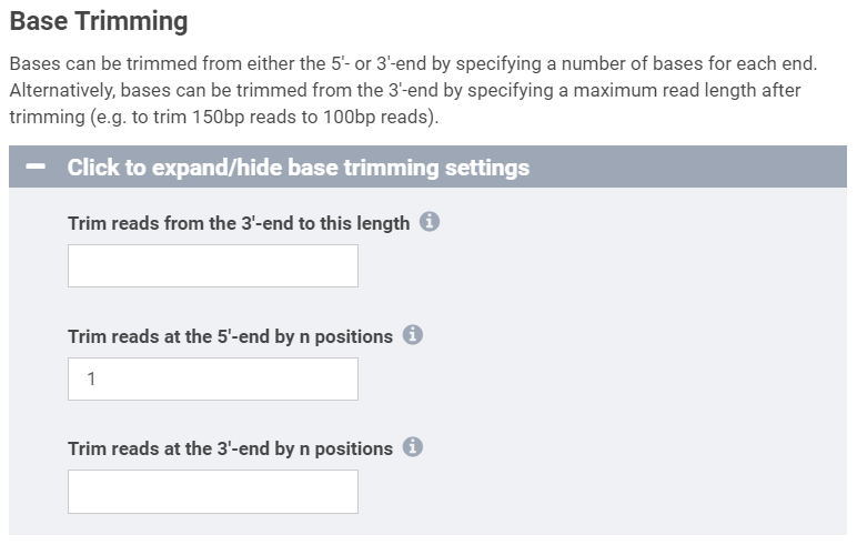In the Base Trimming section, set “Trim reads at the 5’-end by n positions” to 1 to remove the first base from input FASTQ files.
