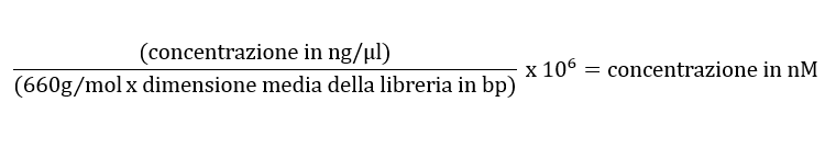Alcune librerie standard di Illumina, come Nextera, richiedono l’utilizzo di metodi fluorimetrici specifici per dsDNA per una quantificazione accurata. Tipicamente, questi metodi misurano la concentrazione di dsDNA in ng/µl. Per convertire la concentrazione da ng/µl a nM per la generazione dei cluster, seguire le istruzioni sottostanti.
