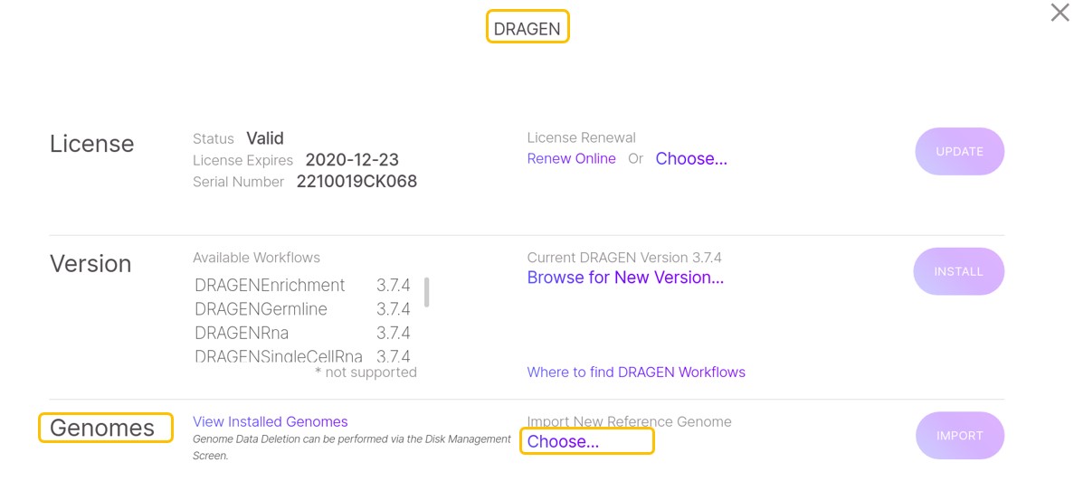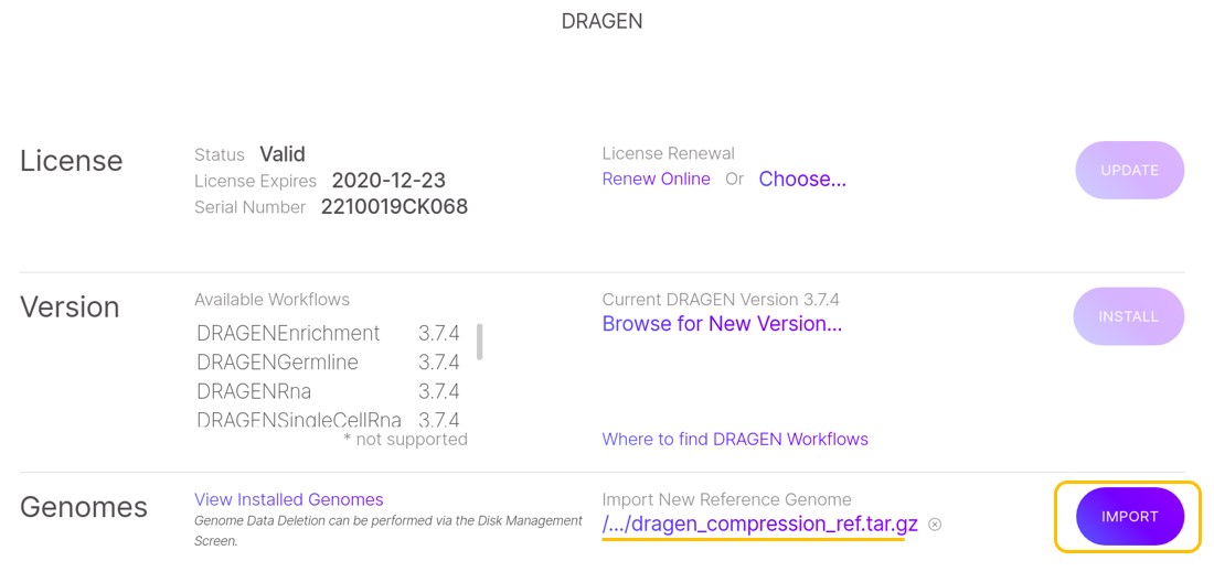 b) 在Genome部分,选择Import New Reference Genomes下面的Choose,找到dragen_compression_ref.tar.gz文件,然后选择Open。