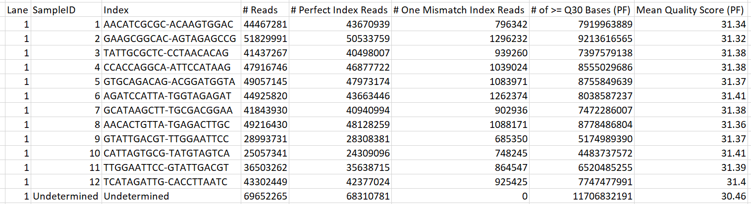 The Demultiplex_Stats.csv file provides the following information: