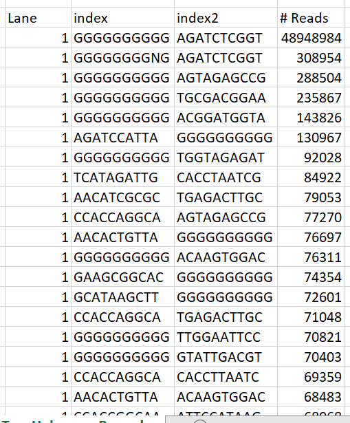 The index and index2 columns provide the sequence of the unknown barcode as it was read by the instrument. The # Reads column provides the number of reads that the combination of index and index2 received.