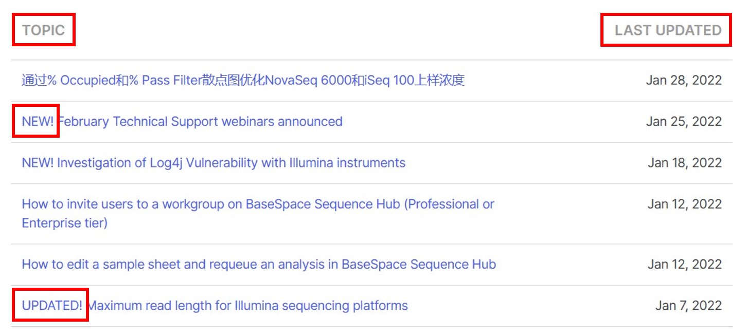This overview supports navigation of the Illumina Technical Bulletins page to make sure that the bulletin of interest can be found easily.