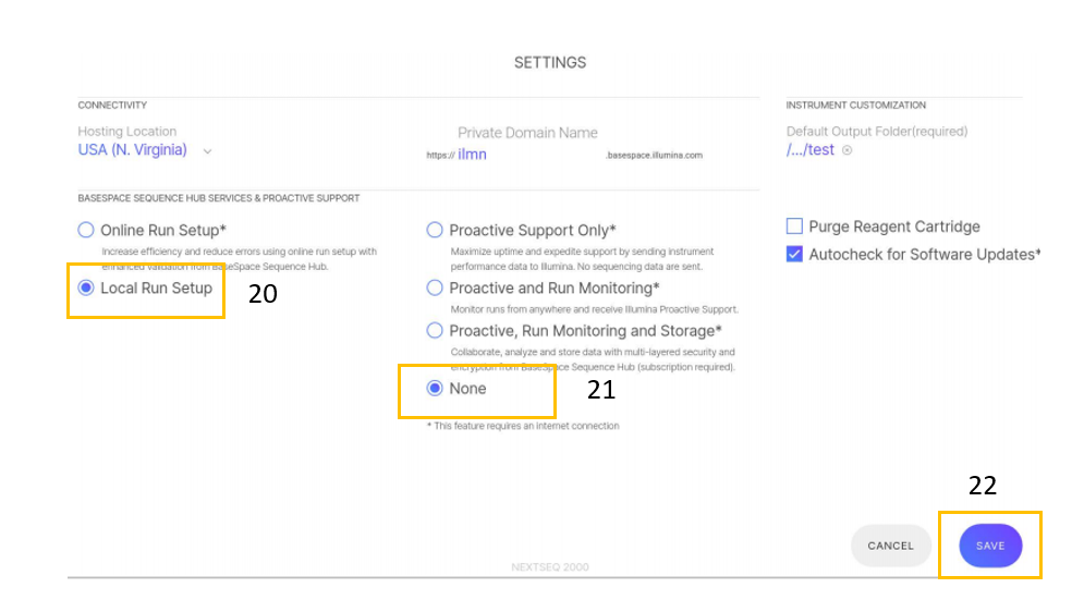 If the instrument is connected to the Internet, run set up using Hybrid mode, Proactive or Run Monitoring using BaseSpace Sequencing Hub is highly encouraged for easy sharing with Illumina Support. If the instrument is not connected to the Internet or the use of BaseSpace Sequence Hub is blocked, Local mode will need to be used.