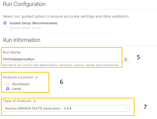- For Read Type, Read 1 length, and Read 2 length, select the best option for the PhiX test run being performed. This information will likely be provided to you by Illumina support.