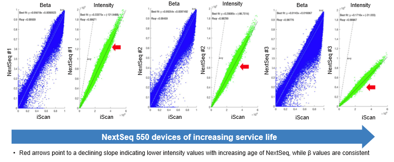 While our data show that NextSeq 550 and iScan provide comparable results, there can be experimental or equipment-specific nuances in different environments that confound comparisons between an iScan device and a NextSeq 550 instrument. In these situations, we recommend carrying out application specific validations.